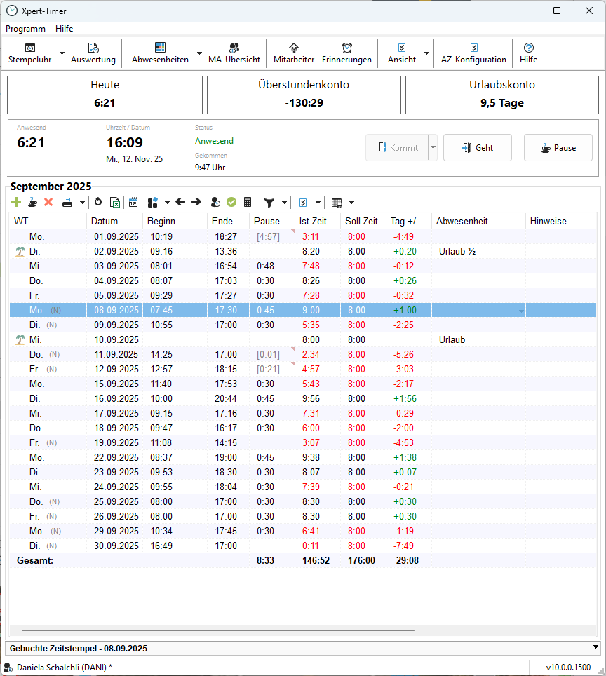 Je nach Zugriffsrechten können die Mitarbeiter die eigenen oder auch die Arbeitszeit der Kollegen einsehen. Üblich ist jedoch, dass jeder Mitarbeiter nur seine eigenen Arbeitszeiten, Abwesenheiten, Überstunden und Urlaubstage einsehen kann.