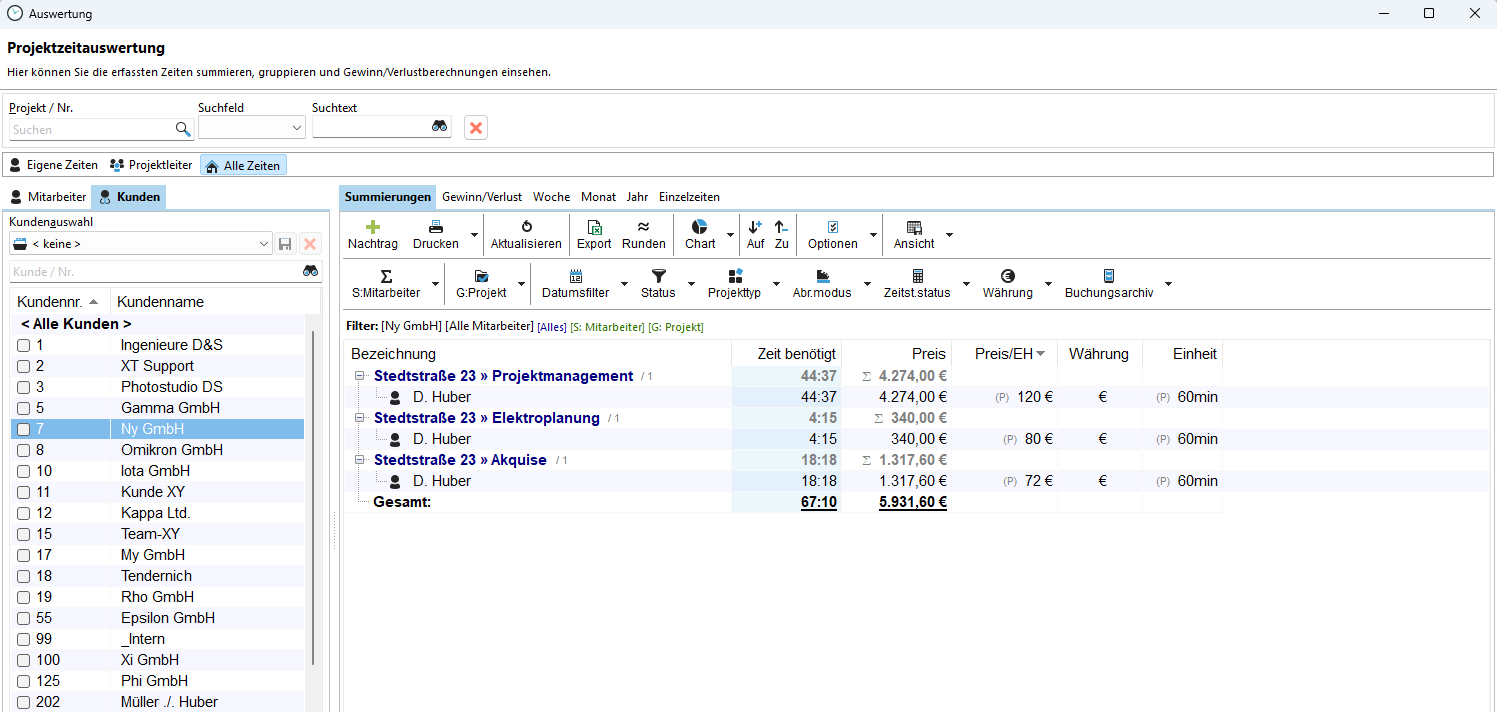 Gewinn-/Verlustrechnungen, Summierungen von Projekten, Gruppierungen und Filter stehen in zahlreichen Kombinationen zur Verfügung. Und reichen die Auswertungen nicht, können die Daten jederzeit aus der Datenbank ausgelesen und weiterverarbeitet werden.